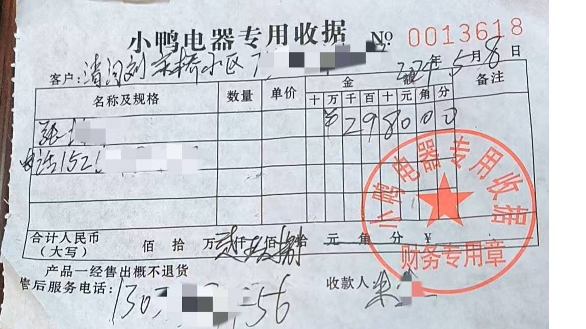 据张女士在节目中讲述,2024年5月,有商家在其小区开展促销活动,设置问答抽奖环节,她的家人因回答问题正确,获得“一等奖”——免费安装小鸭牌净水器。活动现场,商家工作人员展示了净水器的过滤效果,称过滤后的水矿物质含量高于农夫山泉,并承诺,免费安装的净水器需搭配10年滤芯套餐购买,费用2980元,后续每年可免费上门更换滤芯。“当时想着是小鸭的大牌子,又能免费装机,就花2980元买了10年滤芯,给的现金,对方只开了一张写有‘2980元’和‘小鸭电器’字样的收据,也没有正式发票。”张女士表示,净水器安装后仅一个月,即2024年6月,就慢慢的出现嗡嗡异响。她联系售后,对方告知“只要还能制水就先使用,等不制水了再联系”。