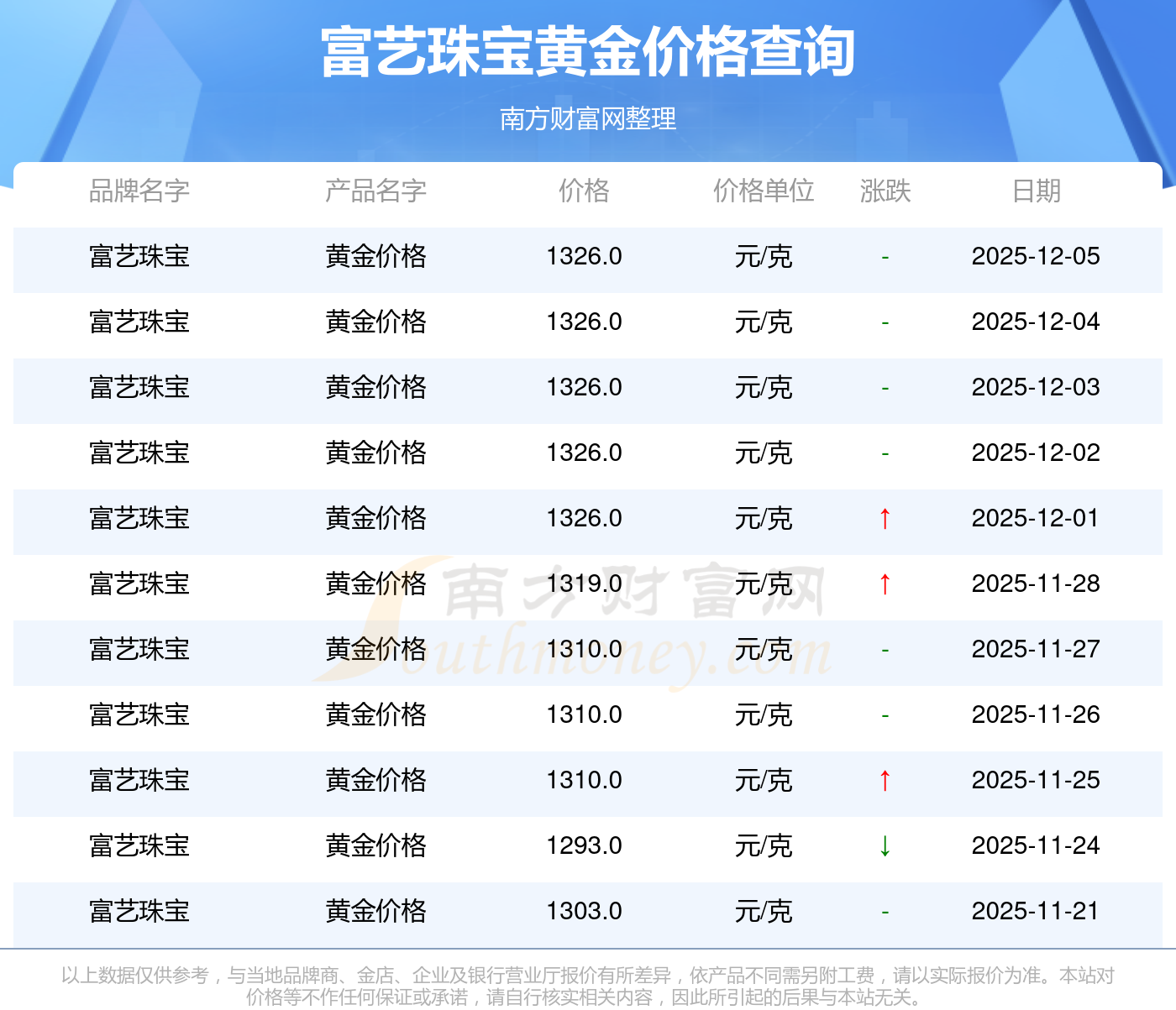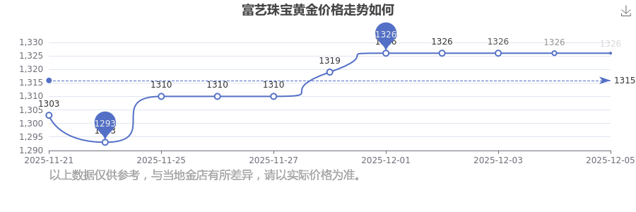 今天金价几何?现在每克黄金值多少钱?金价一般是多少钱一克?据了解,今日富艺珠宝 金价的最新价格为1326.0元/克。